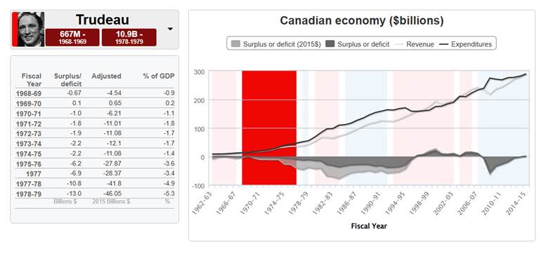 For example, in the year 1974-1975, federal deficit was $2.2 billion (see this useful interactive page on CBC’s website and click on the image of Pierre Trudeau in the panel on the left; the drop-down panel will show the deficit figures for each year he was the prime minister). This deficit was 1.4% of the GDP in 1974-1975.