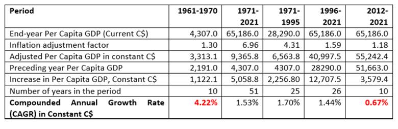 No politician will ever tire of saying that ‘Canada needs immigration to boost our economy’. An ancillary statement is that ‘immigrants pay taxes that support Canada’s social programs’. But as I showed in my article ‘Immigration Does NOT Increase Prosperity’, the inflation-adjusted compounded average growth rate (CAGR) in per capita GDP fell by a precipitous 84% between 1970 and 2021, ending up at an anemic 0.67% in the decade ending in 2021: